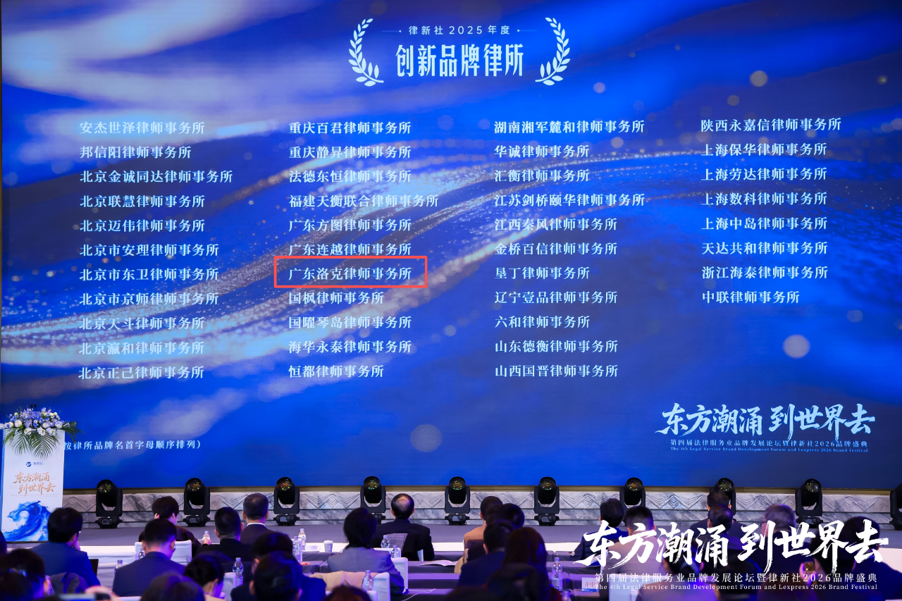 广东洛克律师事务所凭借在发展模式、运营管理、服务产品等方面的突破性创新实践,成功获评律新社 2025 年度 “创新品牌律所”。这一荣誉是对洛克律所深耕创新的肯定,也印证了我们在专业发展道路上的点滴积累。